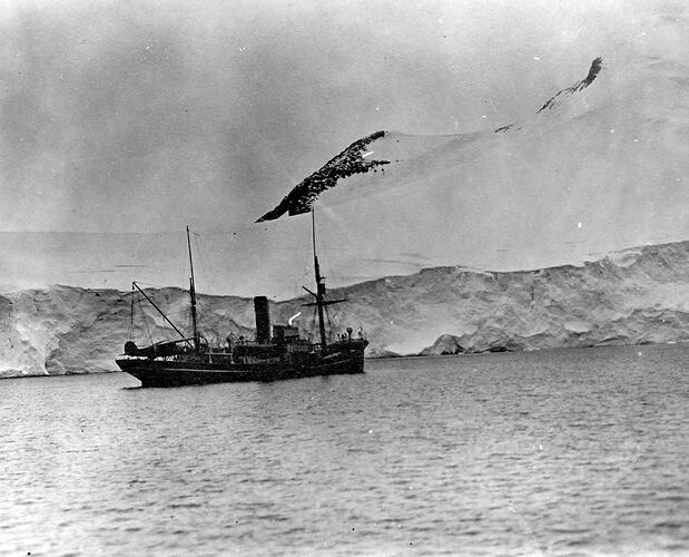 Photograph of a steam ship moored close to a deep snow-covered shoreline with a steep rocky mountain ridge partially visible in the background to the right. On the afterdeck of the ship is a light aeroplane slung from a jib crane boom attached to the aft-mast.