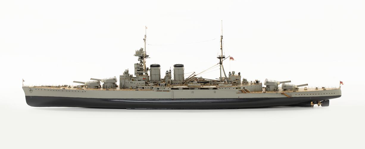 Model of Royal Navy battle-cruiser (42,100 tons) HMS Hood. Following the Battle of Jutland in 1916, considerable extra armour was added to new capital ships under construction including Hood which was launched at the John Brown & Co. yard at Glasgow in August 1918. The vessel's four Brown-Curtis shaft geared turbines used Michell thrust bearings, the invention of Melbourne engineer A.G.M. Michell. Following completion in 1920, Hood was the largest warship of the Royal Navy for over a decade. She served as flagship of the Special Service Battlecruiser Squadron during the "Empire Cruise" in 1923-1924, which included visits to major Australia ports, with a stop-over at Port Melbourne from 17th - 25th March 1924.
