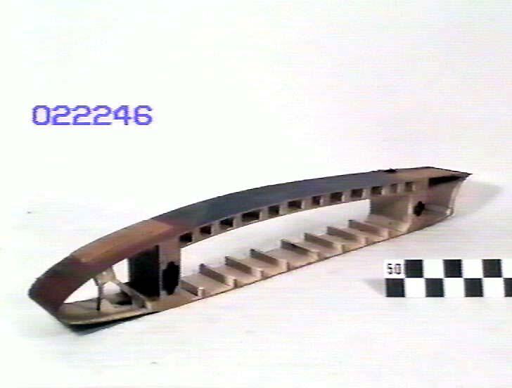 Chordwise cross-section of a de Havilland DH98 Mosquito aircraft wing. Shows twin spar wooden construction incorporating resin bonded plywood, glueing and doped fabric covering.