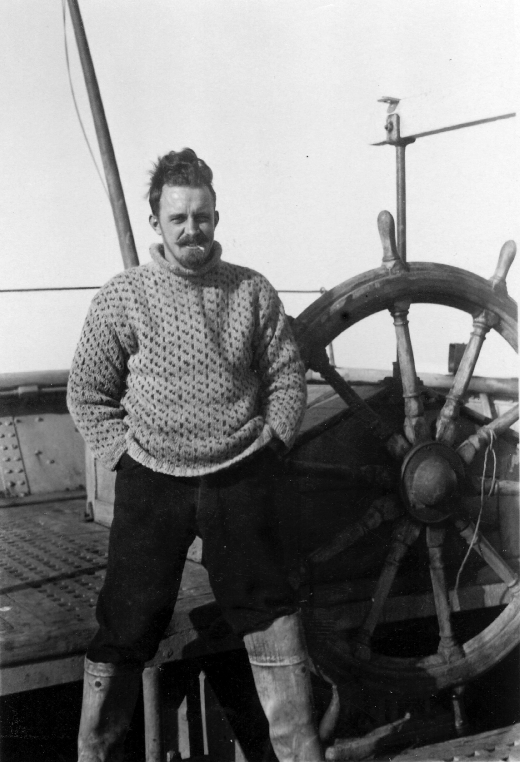 George Rayner standing on deck in front of a ship's steering wheel, during an expedition to Antarctica. He has his hands in his pockets and a cigerette stub in this mouth and is wearing the same clothes as in ST 041516, except for the hat.
