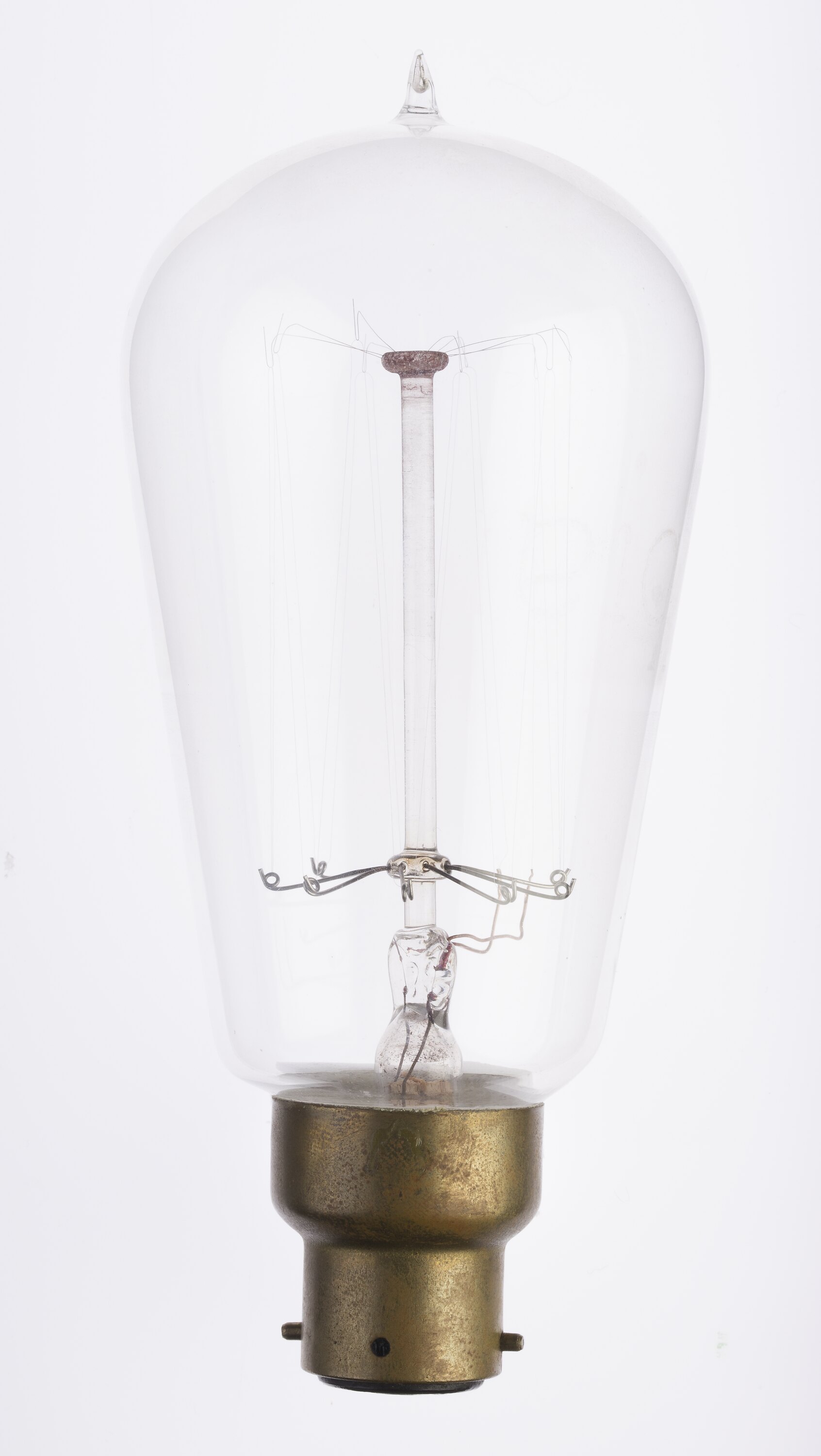 203 mm (8 inch) circumference glass globe. Straight tungsten filament, zig-zagged circumferentially between 10 wire supports in a 'squirrel cage' arrangement. Exhausted at top of globe. Brass bayonet cap. Double pin contact.