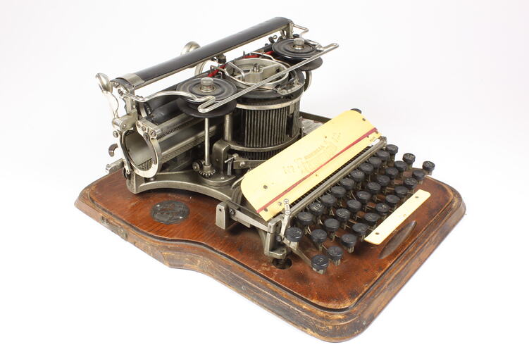 Serial number engraved on left-hand end of frame beneath carriage: '98896' On plate above and behind keyboard: 'MADE IN U.S.A. / No. Hammond 12' Around hub of each ribbon spool: 'THE HAMMOND TYPEWRITER' On disc attached to baseboard to left of frame beneath carriage: 'MADE IN / NEW YORK / TRADE /[Double world hemisphere image] / MARK / TYPEWRITER / U.S.A. / PATENTED' Also on disc, vertically on left side of trade mark: 'FOR ALL NATIONS' and on right side: 'AND TONGUES' Engraved on shield attached to baseboard to right of frame below carriage: 'J. SELBY LINK / SOLE IMPORTER / MELBOURNE / AUSTRALIA' On front of wooden cover: 'Hammond' On label adhered to underside of cover: [Instructions in English, French, Spanish and German]