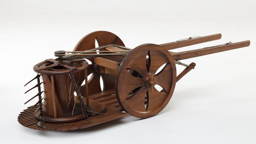 The display label that accompanied the model reads: the machine is pushed through the crop by a horse. A bevelled crown wheel attached to one of the carriage wheels operates three sickle-like blades by means of gears and a rope drive. Underneath the front part of the machine are two small supporting wheels on which the machines runs. The comb in front holds the straw while being cut, and it may be raised or lowered by an adjusting lever under each shaft. The blades are fastened to a circular framework supported on three rollers and revolving round a central stationary capstan-shaped drum having a broad longitudinal recess in it. Above each blade is a rake consisting of six pivoted projecting fingers, which, collecting the cut corn and carrying it to the left side, throw off in a bundle. This occurs when the rake trips on reaching movement being aided by a spring wire on each finger. On reaching the other side of the recess, the fingers are automatically put into position again for collecting the cut corn.