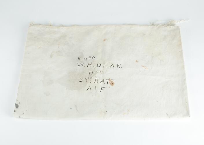 White kit bag marked 'No. 1190/ W.H. DEAN./ D. COY/ 39TH. BATT/ A.I.F'.