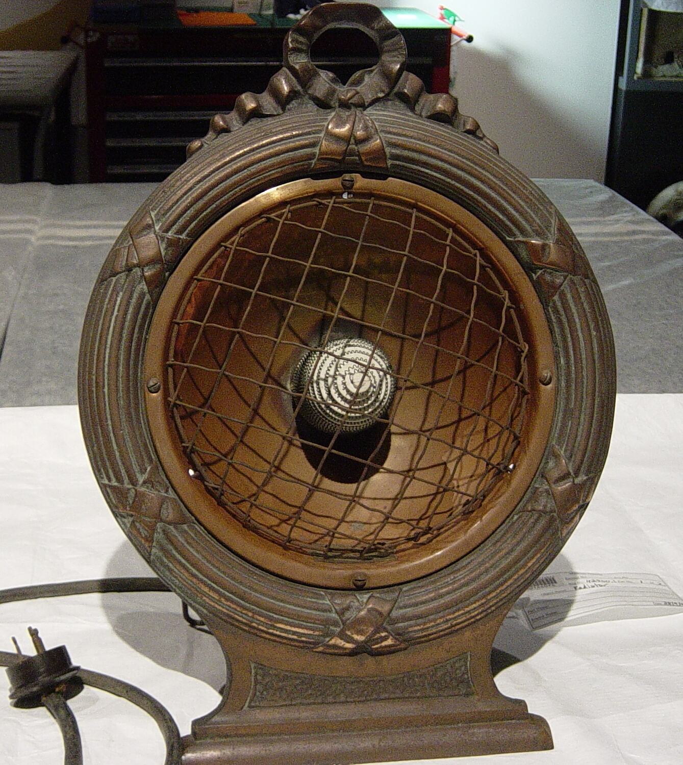 Reflector dish surrounded by a wreath motif moulding. There is a wire safety grill at the front and wire support at the back. Features company logo of a volcano. Wattage and voltage markings not visible but probably 230 V and 1000 W.