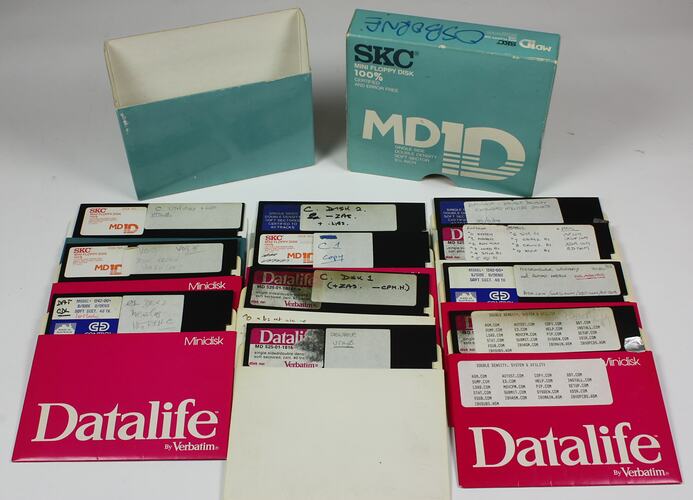 On each side and top of box: SKC / MINI FLOPPY DISK / 100% / CERTIFIED / AND ERROR FREE / MD1D / SINGLE SIDE / DOUBLE DENSITY / SOFT SECTOR / 5 1/4 INCH The disks carry various printed and handwritten labels indicating their contents.