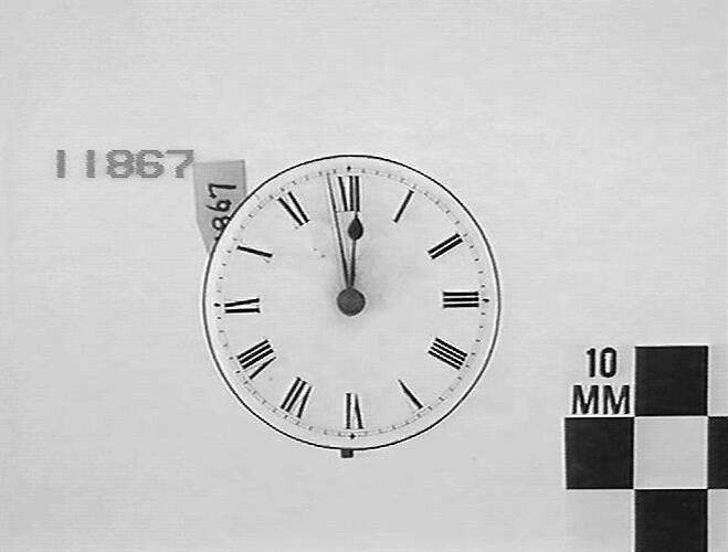 White dial has roman numerals. Fusee and chain; winding dial. Key wound spring; cylinder escapement.