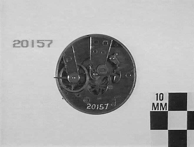 One of several watch movements donated by Ingram Brothers jewelers in 1937. During the 1930s Depression, customers would bring in gold or silver fob watches to sell for the value of the gold or silver. Ingrams (and other jewelers) melted down the cases to sell the metal, but kept the movements of historically interesting watches.