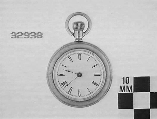 Plated case with floral pattern in circle on back. White enamel dial has roman numerals and blue hands. Stem and button wound spring; duplex escapement.