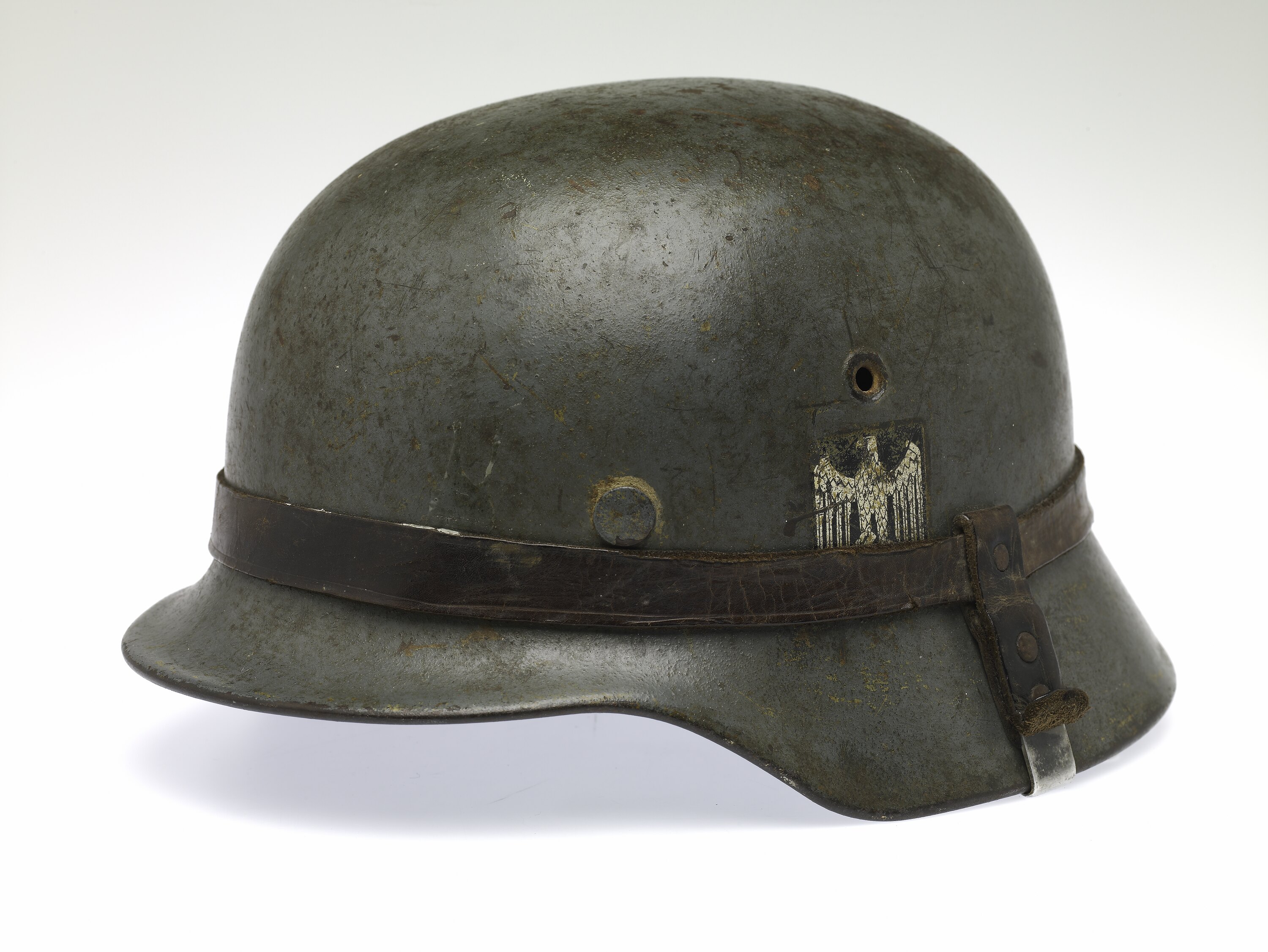 Steel helmet with a black and silver German Army eagle decal on the left hand side. Leather strap around helmet just above rim.