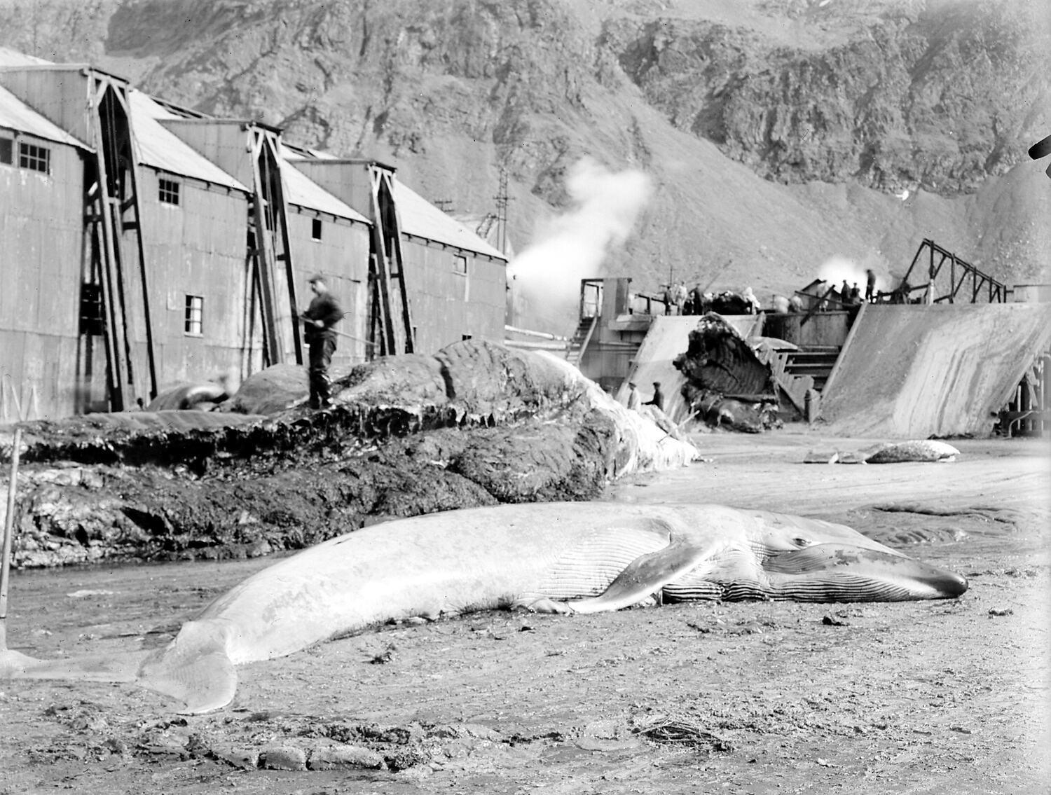 A carcass of a blue whale foetus, measuring 7.46 metres long, lying on the beach in front of a whaling station. Taken 5 April 1928, possibly on South Georgia.