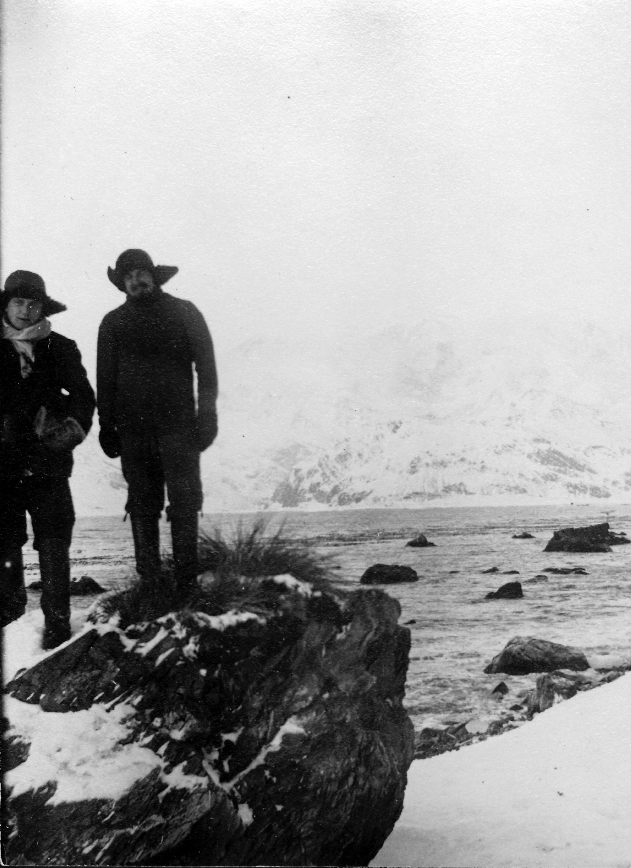 Two people standing on a rocky outcrop in front of a body of water that appears to be either a river, coastal inlet or channel between two islands. Most of the landscape is snow covered but the outcrop on which the figures are standing has a tuft of grass growing on top. The person on the right is George Rayner who created this series of photographs taken in Antarctica and sub-antarctic islands during the early 1930s.