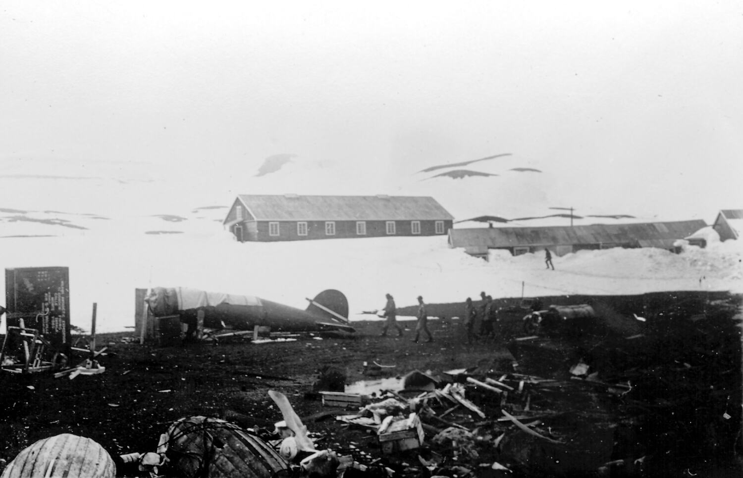 Debris on beach, Whalers Bay, Deception Island, November 1929. In the foreground are broken wooden packing crates and two small upturned boats. In the middle ground is an aircraft fuselage (without wings), possibly in the process of being assembled, covered by a tarpaulin. In the background on rising ground are two long single-gabled buildings that appear to be dormotories for a scientific station or whaling base, surrounded by deep snow drifts.