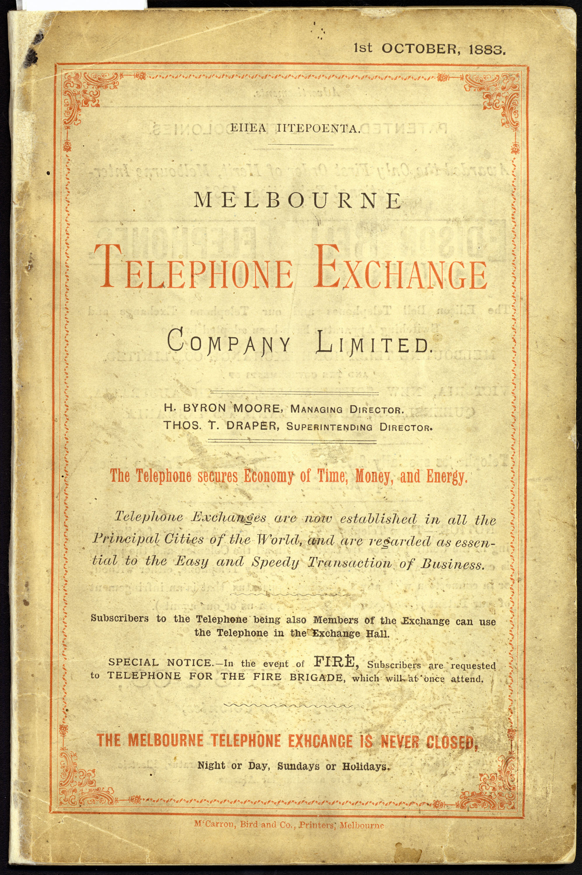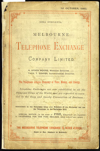 Text, front cover: 1st OCTOBER, 1883/EIIEA IITEPOOENTA/MELBOURNE/TELEPHONE EXCHANCE/COMPANY LIMITED/The Telephone secures Economy of Time, Money, and Energy/THE MELBOURNE TELEPHONE EXCHANGE IS NEVER CLOSED.