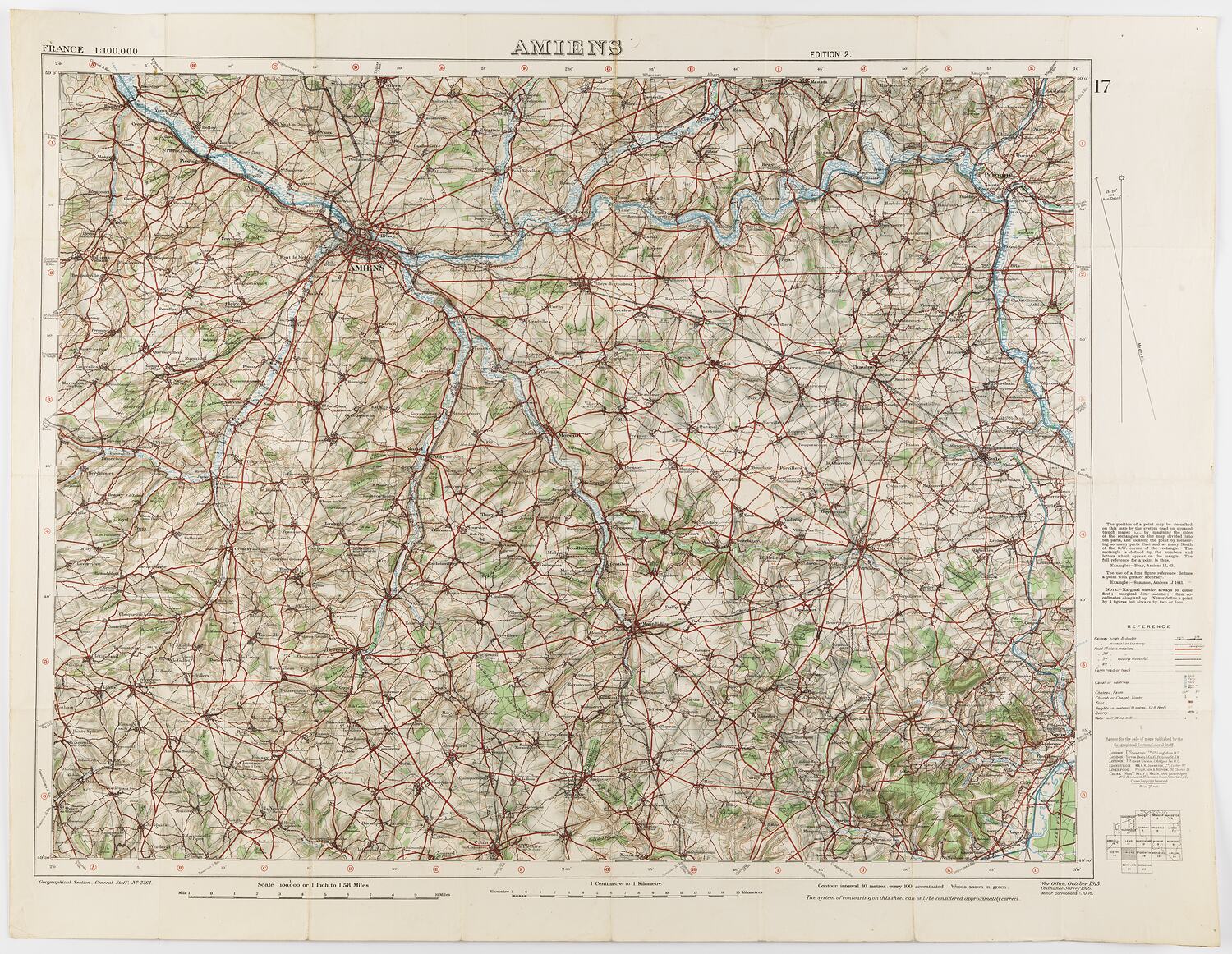 On front: 'FRANCE 1:100,000 / AMIENS / EDITION 2. / Geographical Section, General Staff, No. 2364...War Office, October 1915. / Ordnance Survey 1916 / Minor Corrections 1.10.16.' Extensive text throughout. On back: 'AMIENS 17. / FRANCE. / 2nd EDITION. / Scale 1/100,000'.