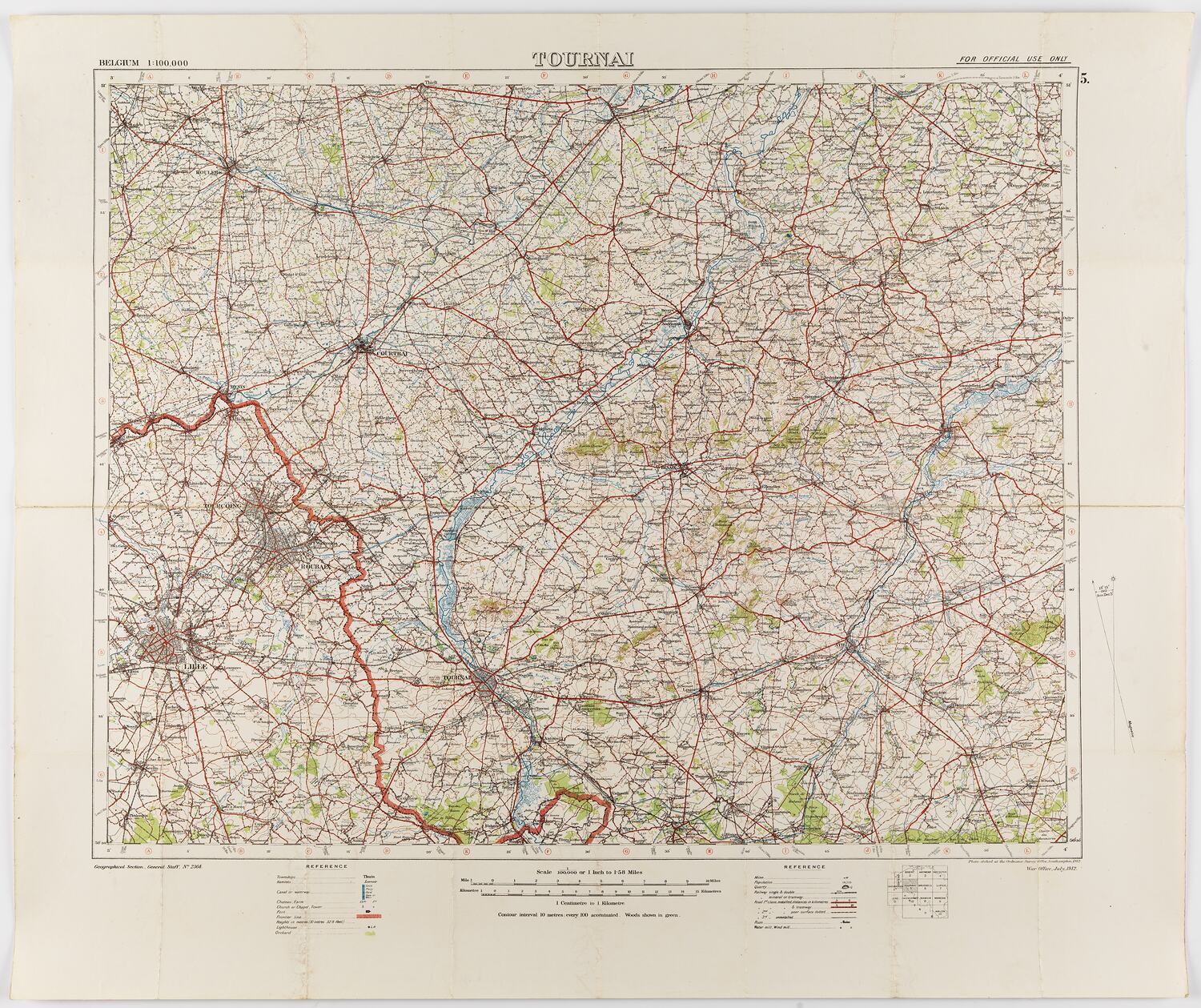 Map of Belgium - Sheet Tournai, 5, scale 1:100,000. The map was photo-etched at the Ordnance Survey Office, Southampton, in 1912, and was published by the War Office, July 1912. The map is labelled Geographical Section, General Staff, No. 2364. It would have been in use during World War I.