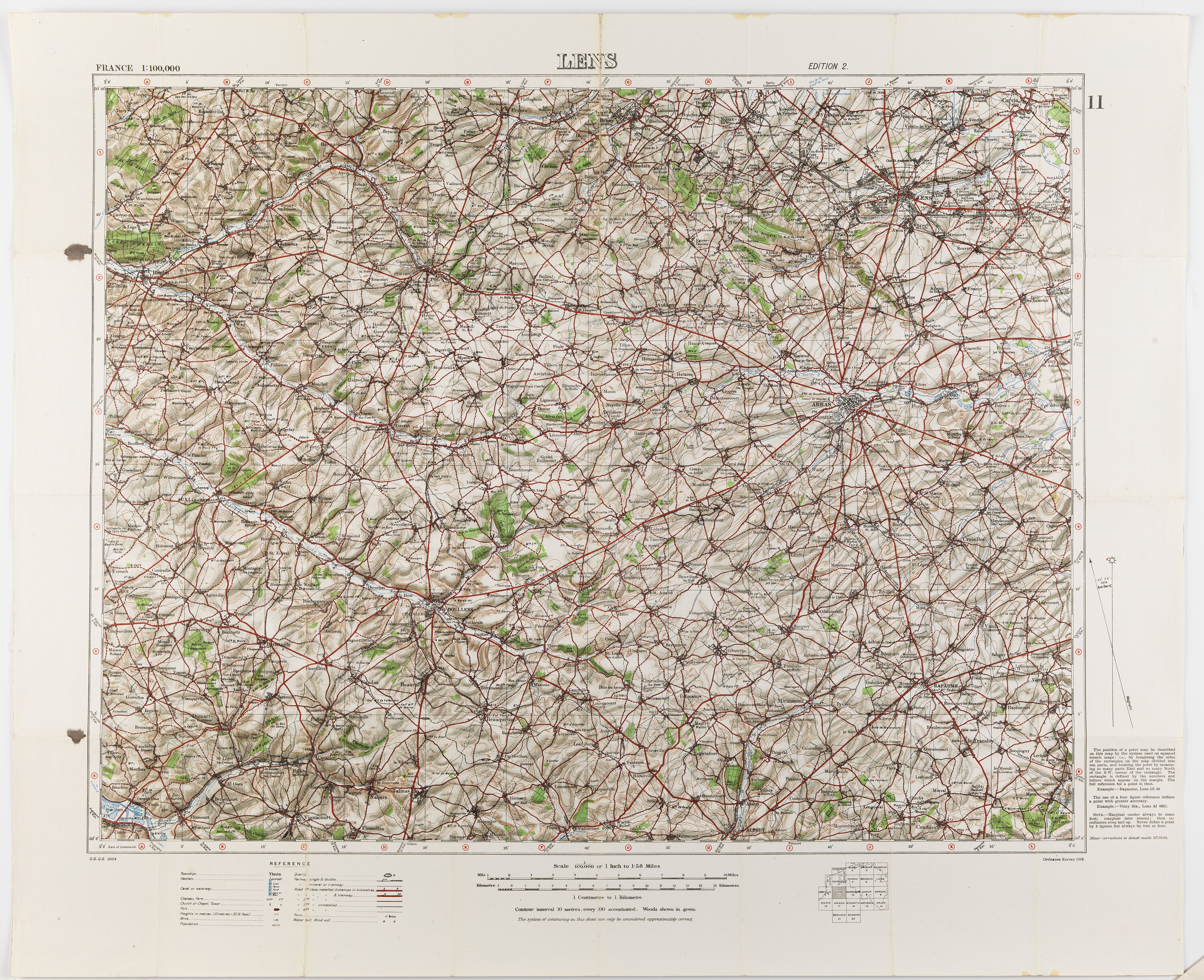 Printed on front: 'FRANCE 1:100,000 / LENS / EDITION 2. / G.S.G.S. 2364 / Ordnance Survey 1916. / Minor corrections to detail made 27-10-16'. Extensive text follows. Printed on reverse: 'LENS 11. / EDITION 2. / FRANCE. / Scale / 1/100,000.'