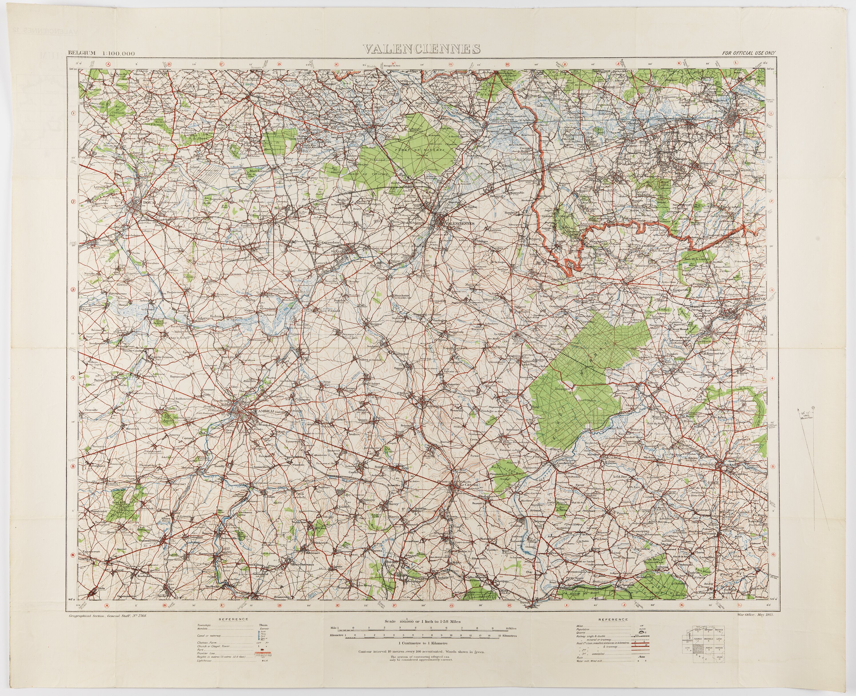 Printed on front: 'BELGIUM 1:100,000 / VALENCIENNES / FOR OFFICIAL USE ONLY / Geographical Section, General Staff, No. 2364 / War Office, May 1915'. Extensive text follows. Printed on reverse: VALENCIENNES 12 / BELGIUM / Scale 1/100,000'.