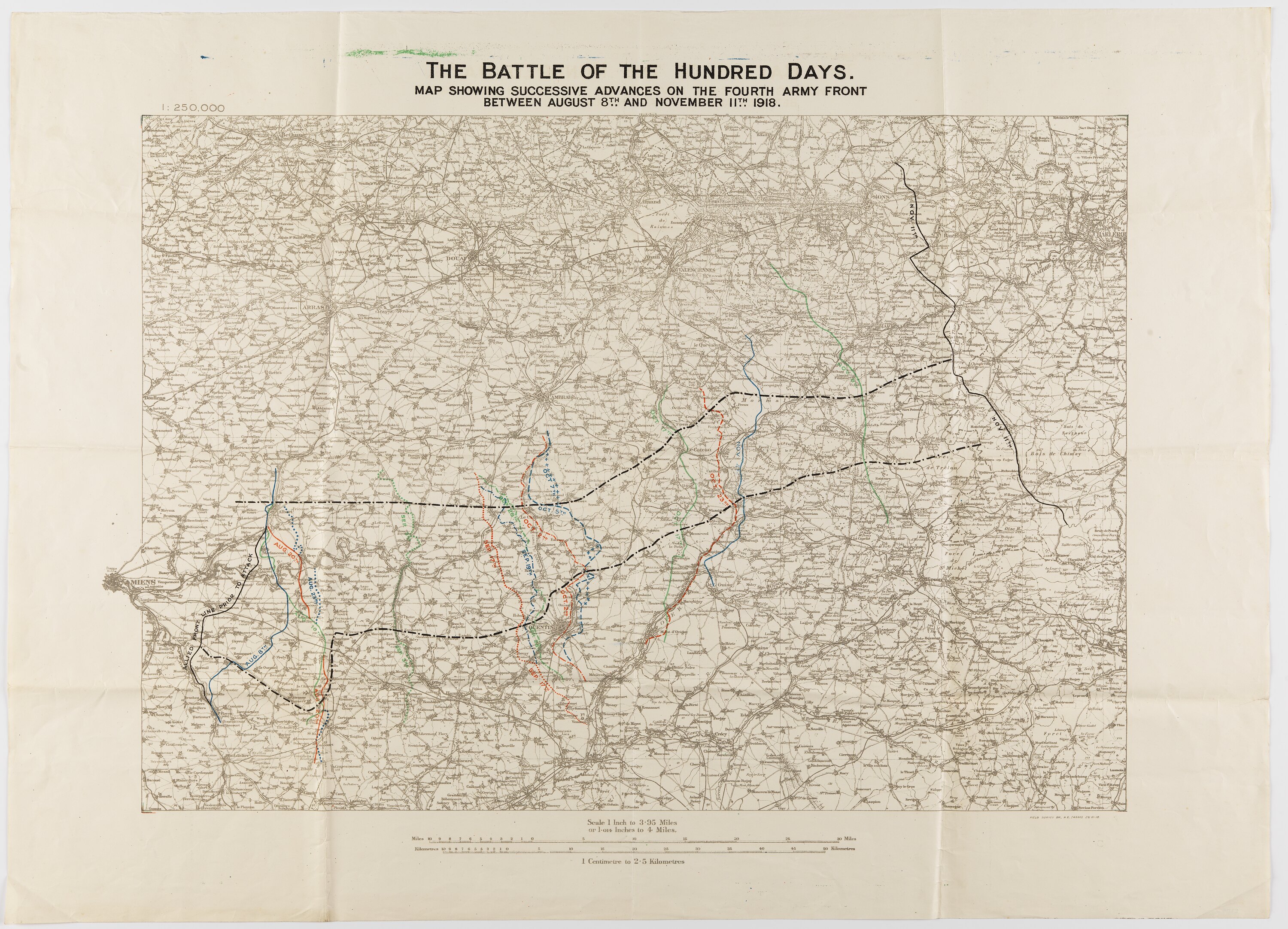 Field survey map of France, scale 1:250,000, titled 'The Battle of the Hundred Days', showing the successive advances on the Fourth Army front between 8 August and 11 November 1918, leading up to the Armistice. The map is dated 26 November 1918.