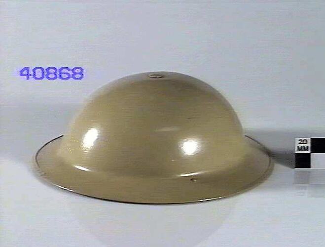 Khaki-coloured steel helmet, with smooth crown. Brim all around. Rivet on either side to secure chin strap. Chin strap - cotton canvas centre with canvas covered elastic on each side attached to helmet. Screw in centre of crown. Inside of helmet has leather supporting harness. Inside of helmet at crown circular foam like substance with leather cover and circular hole in centre of pad. Impressed inscription on underside of left side of brim.