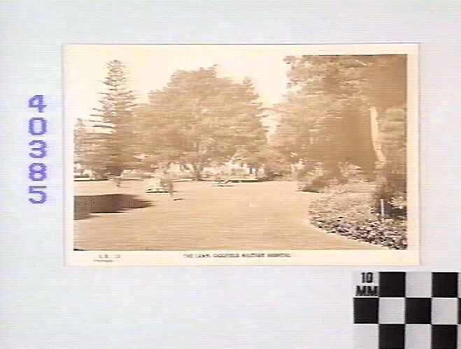 Photograph of the lawn, Caulfield Military Hospital, World War I. One of a series of images that promote the facilites at the hospital.