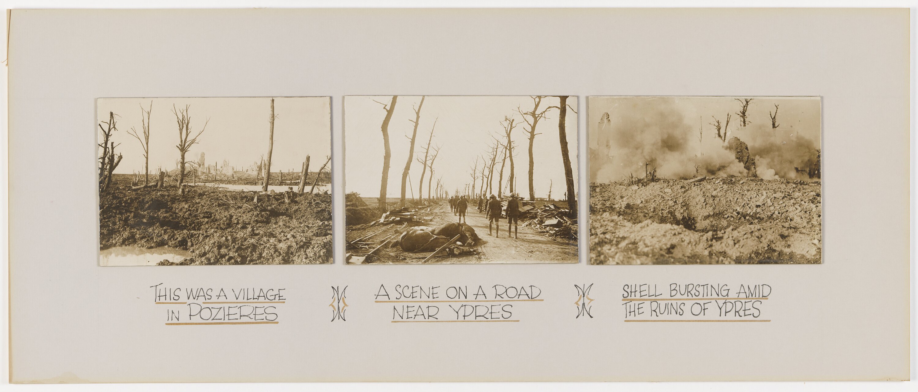 Triptych of black and white photographs. The left image shows a heavily-damaged battlefield with stripped trees, a water-filled crater and damaged buildings in background; the centre photograph shows soldiers walking away on a road through a remnant avenue of trees, with dead horses in the foreground; and the right photograph shows a shell bursting on a heavily-damaged battlefield.