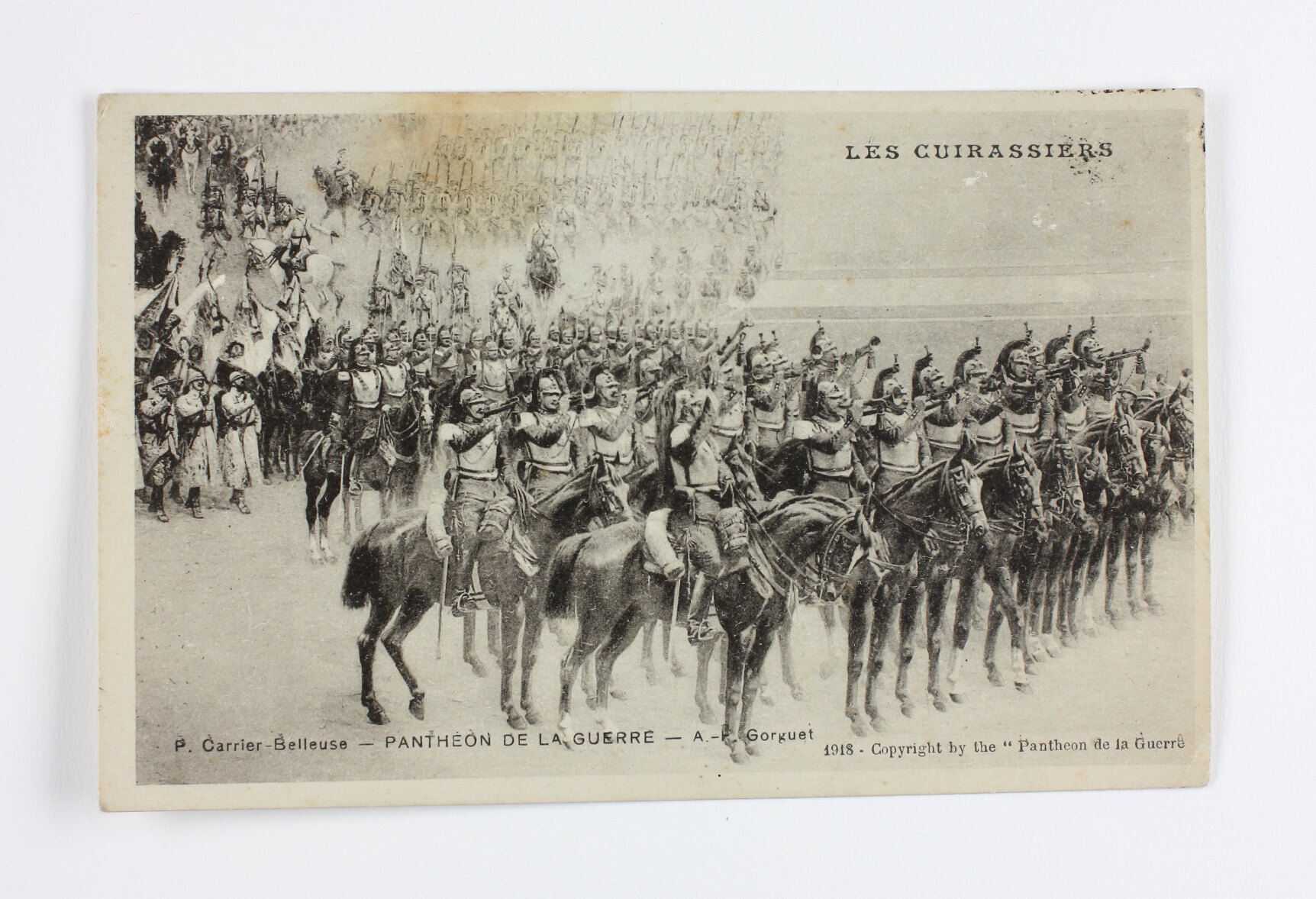 French souvenir postcard titled 'Les Cuirassiers'. It depicts part of the massive panoramic painting 'Pantheon de la Guerre', coordinated by Pierre Carrier-Belleuse and Auguste François-Marie Gorguet (named on the postcard) and painted by more than 100 French artists during World War I. It was started soon after war broke out, and was completed just before the Armistice. All of the Allies were eventually depicted, including around 6,000 individuals. The painting remains amongst the largest in the world. The section of Pantheon de la Guerre shown on the postcard is the French armed cavalry, who wore their traditional uniform in the early stages of World War I.