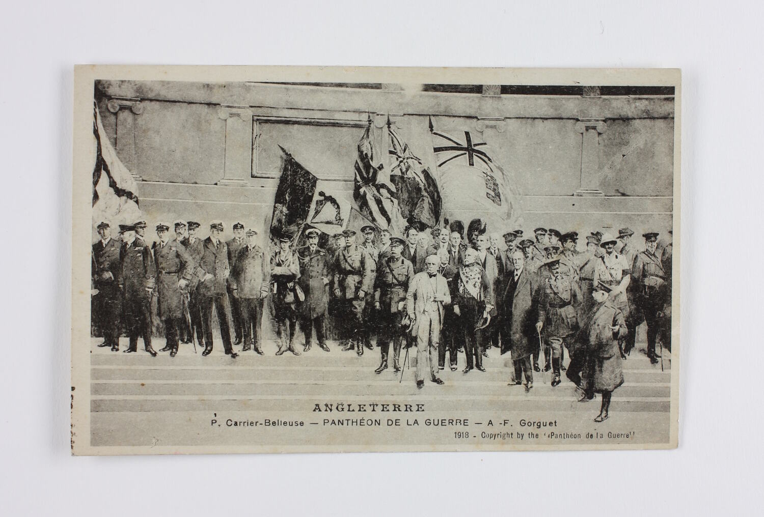 Printed on front: 'ANGLETERRE / P. Carrier-Belieuse - PANTHEON DE LA GUERRE - A -F. Gorguet / 1918 - Copyright by the ''Pantheon de la Guerre''. Printed on back: 'CARTE POSTALE / CORRESPONDANCE / ADDRESSE / IMP LE DELEY, PARIS / Edit Art H. Manuel. Paris'.