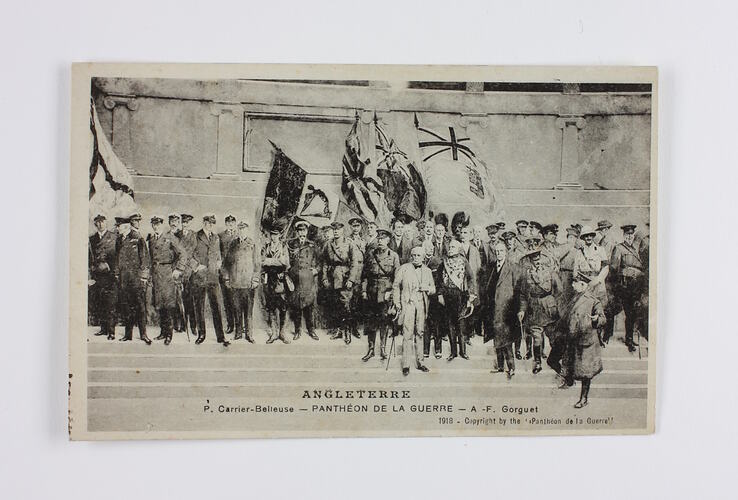 French souvenir postcard titled 'Angleterre - Pantheon de la Guerre'. It depicts part of the massive panoramic painting 'Pantheon De La Guerre', coordinated by Pierre Carrier-Belleuse and Auguste François-Marie Gorguet (named on the postcard) and painted by more than 100 French artists during World War I. It was started soon after war broke out, and was completed just before the Armistice. All of the Allies were eventually depicted, including around 6,000 individuals. The painting remains amongst the largest in the world. The section of Pantheon de la Guerre shown on the postcard is the British contingent, on the steps of a public building.