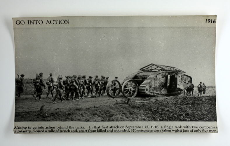 Printed on front: 'GO INTO ACTION 1916 / Waiting to go into action behind the tanks. In the first attack on September 15, 1916, a single tank with two companies / of Infantry cleared a mile of trench and, apart from killed and wounded, 370 prisoners were taken with a loss of only five men. '