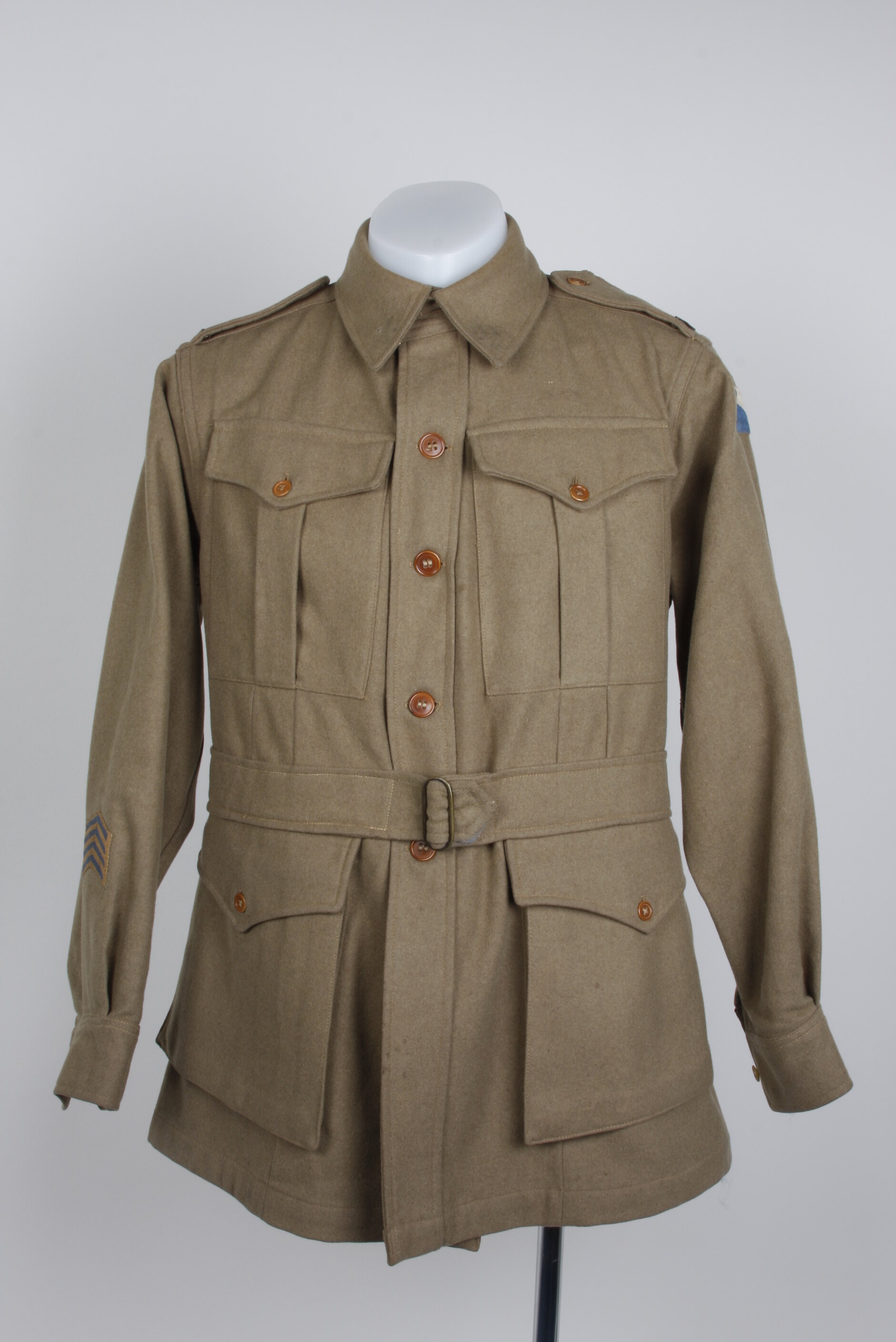 Khaki heavy woollen tunic. Unlined. Pleated breast patch pockets with pointed flap and single button closure, same fabric belt stitched in place, two below waist expanding patch pockets with pointed flap and single button closure. Placket front with five button closure and press stud at neck line. Pointed collar. Collar has holes at each point. Epaulettes with single button closure with bronze AUSTRALIA badge. Sleeves are pleated in to button cuffs. Back has yoke and pleat. Inside patch posket on right hand side. Small repair inside lower front at right hand side. Blue and white colour patch at top of both sleeves and service stripe at bottom of right sleeve.