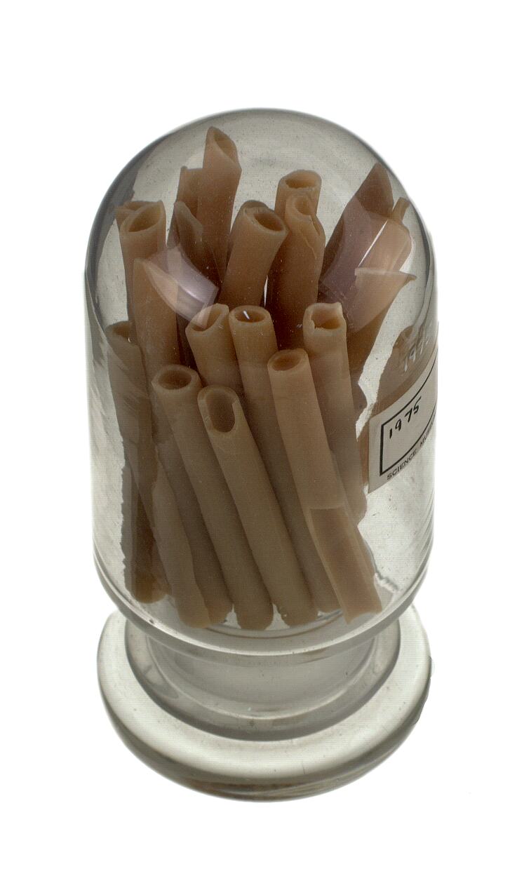 Sample of plain, large, uncut macaroni made from wheat. Housed in a clear glass domed jar. Made by Lucini and Co., Daylesford Victoria, circa 1901.