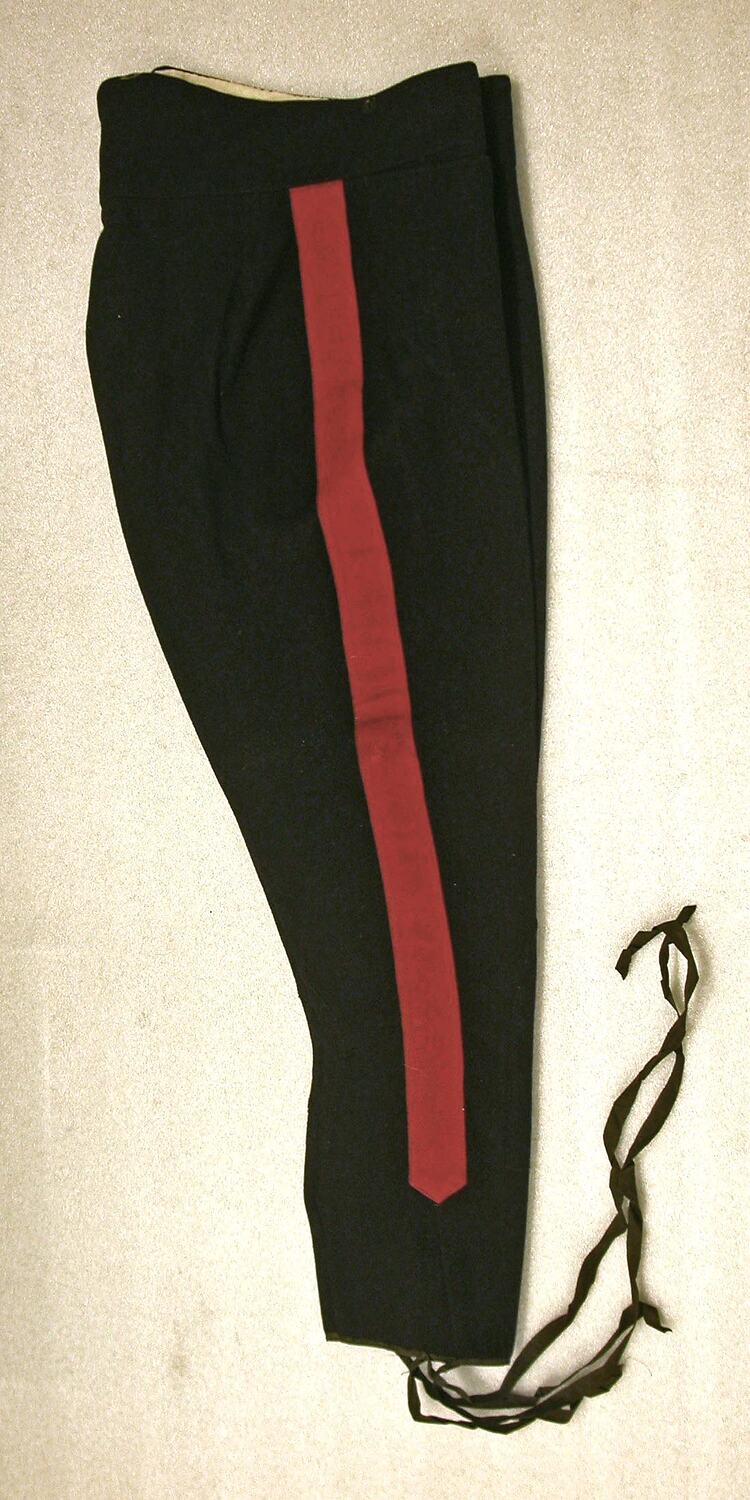 Black woollen full dress trousers with 1 3/4" red stripe down both legs. Tapered at the ankles with long grey-black twill ribbons to fasten. Reinforcing on inner legs. Fastens with buttons at front, and further suspender buttons at front and back. Small pocket front right. Lined with calico at waistband. Waistband higher at back than front.