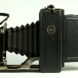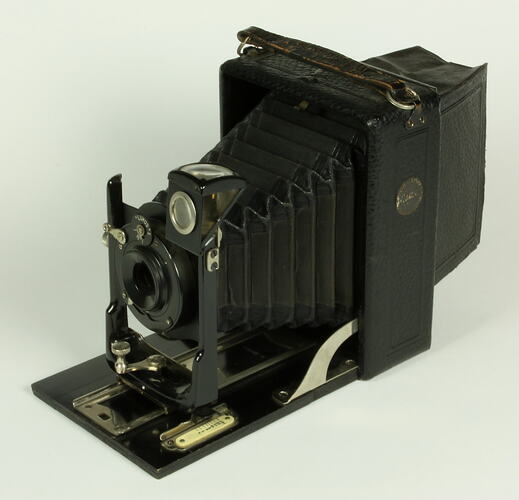 The camera has a polished ebonised baseboard and nickel fittings, covered in Morocco-grained leatherette. Black leather bellows. Black enamelled brass lens panel. 'Real brilliant' reversible view finder, which can be rotated through 90 degrees and locked into two fixed positions by a retaining spring, for either portrait or landscape format photographs.Patent infinity catch for fixing camera for snapshot work. Single metal slides. Focused by sliding the lens in or out, adjusting the lens position pointer against a graduated scale, or be viewing through the back ground glass screen. The back plate with viewing screen slides off the camera body and has a rectangular fold-out light shade.