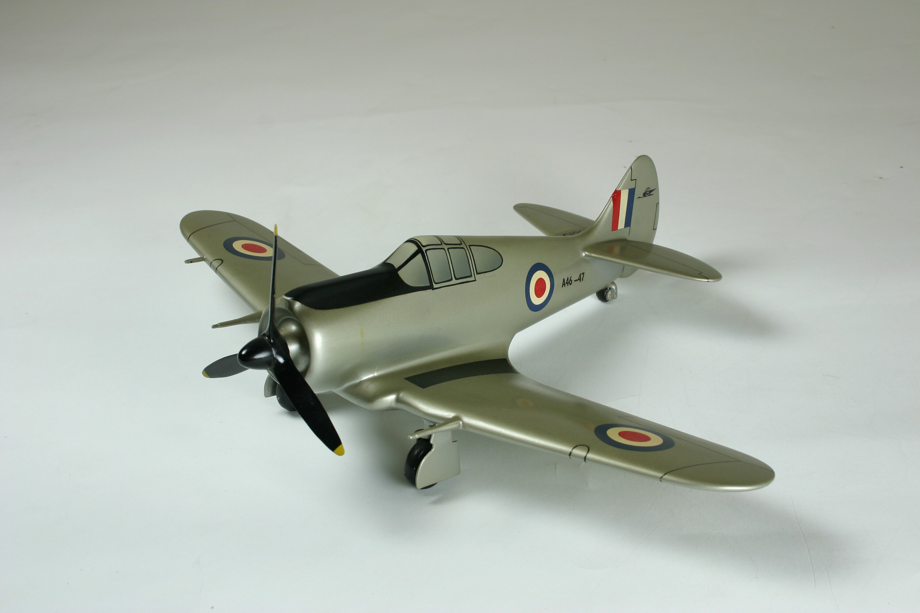 This 1:30 scale model is painted in a silver scheme with black anti-glare panel and post-war roundels. It carries the serial number A46-47 which represents a Boomerang which served with 83 Squadron RAAF and 2 OTU. The paint scheme is not representative of the appearance of Boomerangs used by the RAAF which were camouflaged and carried wartime blue and white RAAF roundels. The Museum acquired the model from the Commonwealth Aircraft Corporation in 1954 at the conclusion of the 'Jubilee of Flight' exhibition at the former Science Museum of Victoria in 1953-54. It had been loaned to the Museum for the exhibition but was then donated by CAC Manager Sir Lawrence Wackett. It is apparently a factory model used for promotional or display purposes.
