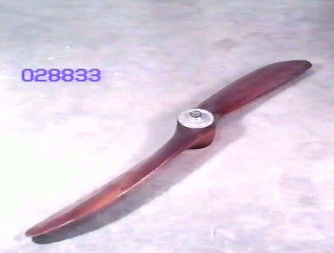 The two-blade laminated mahogony propeller in the Museum's collection was donated in 1973. It is marked 'Wolseley Viper' which was the engine type used in all RAAF SE 5a aircraft. It carries the numbers '287405' and '596LL'. A 'Smiths' pressure gauge has been mounted in the hub of the propeller which was a typical decorative use of an obsolete wooden propeller although this example has fortunately not had the blades sawn off.