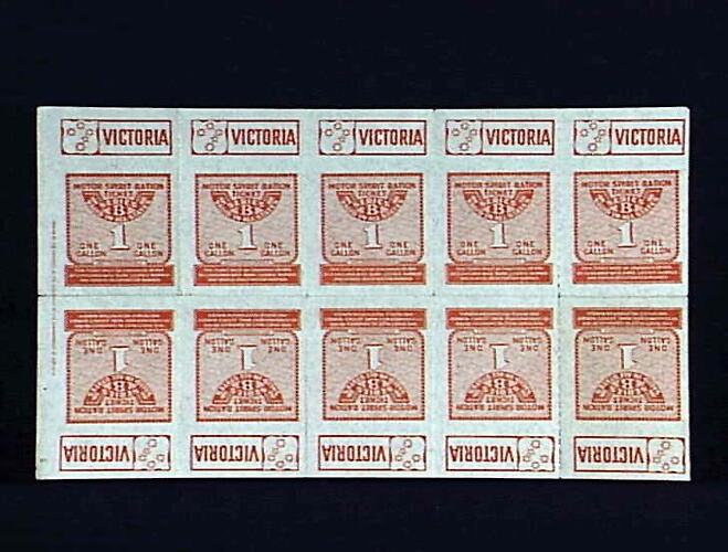 Set of ten one-gallon ration tickets contained on one sheet. Issued in Victoria during or after World War II, in 1941-1949.