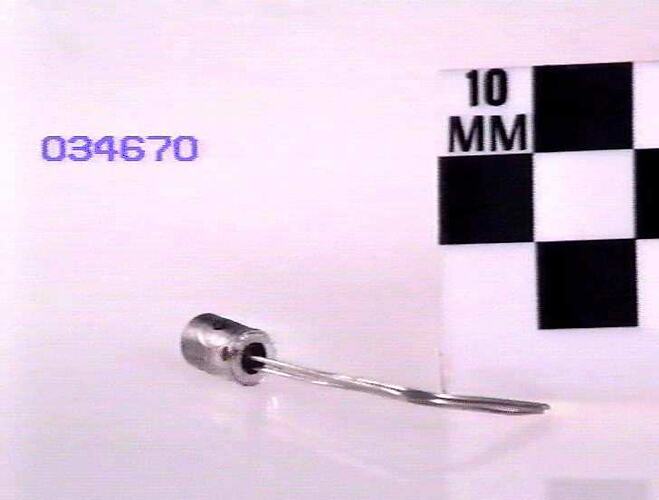 Small tin can with four wires protruding from one end. Red dot to indicate polarity.