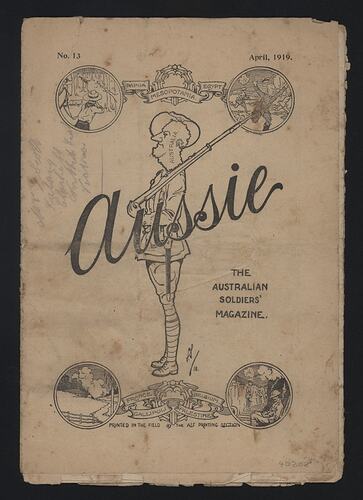 Printed on cover: No. 13/ April, 1919/ PAPUA/ MESOPOTAMIA/ EGYPT/ Aussie/ THE AUSTRALIAN SOLDIERS' MAGAZINE./ FRANCE/ GALLIPOLI/ BELGIUM/ PALESTINE/ PRINTED IN THE FIELD BY THE A.I.F. PRINTING SECTION