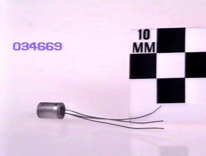 Small tin can with three wires protruding from one end. Red dot to indicate polarity.