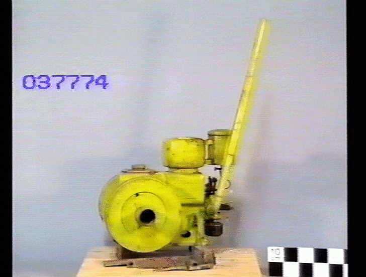 Self-contained single-cylinder horizontal stationary crude oil engine painted yellow-green, with tall vertical stand-pipe exhaust. Specifications: Bore x Stroke: 3½-inch x 5-inch (88.9 mm x 127 mm) Power Rating: 2½ brake horsepower (1.86 kW) at 600 r.p.m. Crankshaft: 1 5/8-inch diameter Flywheels: Two solid disc type of 20-inch diameter x 2 3/8-inch face x 3 5/8-inch deep rim Belt Pulley: 4½-inch diameter x 4½-inch wide Fuel Tank: 7-inch diameter x 9-inch high Exhaust Pipe: 2-inch diameter x 66½-inch high Top Water Hopper: 12-inch x 9½-inch oval shaped x 9¼-inch high, with 6½-inch diameter hole in top Holding Down Bolt Hole Centres in Bottom Flange of Crankcase Casting: 21¼-inch x 8-inch