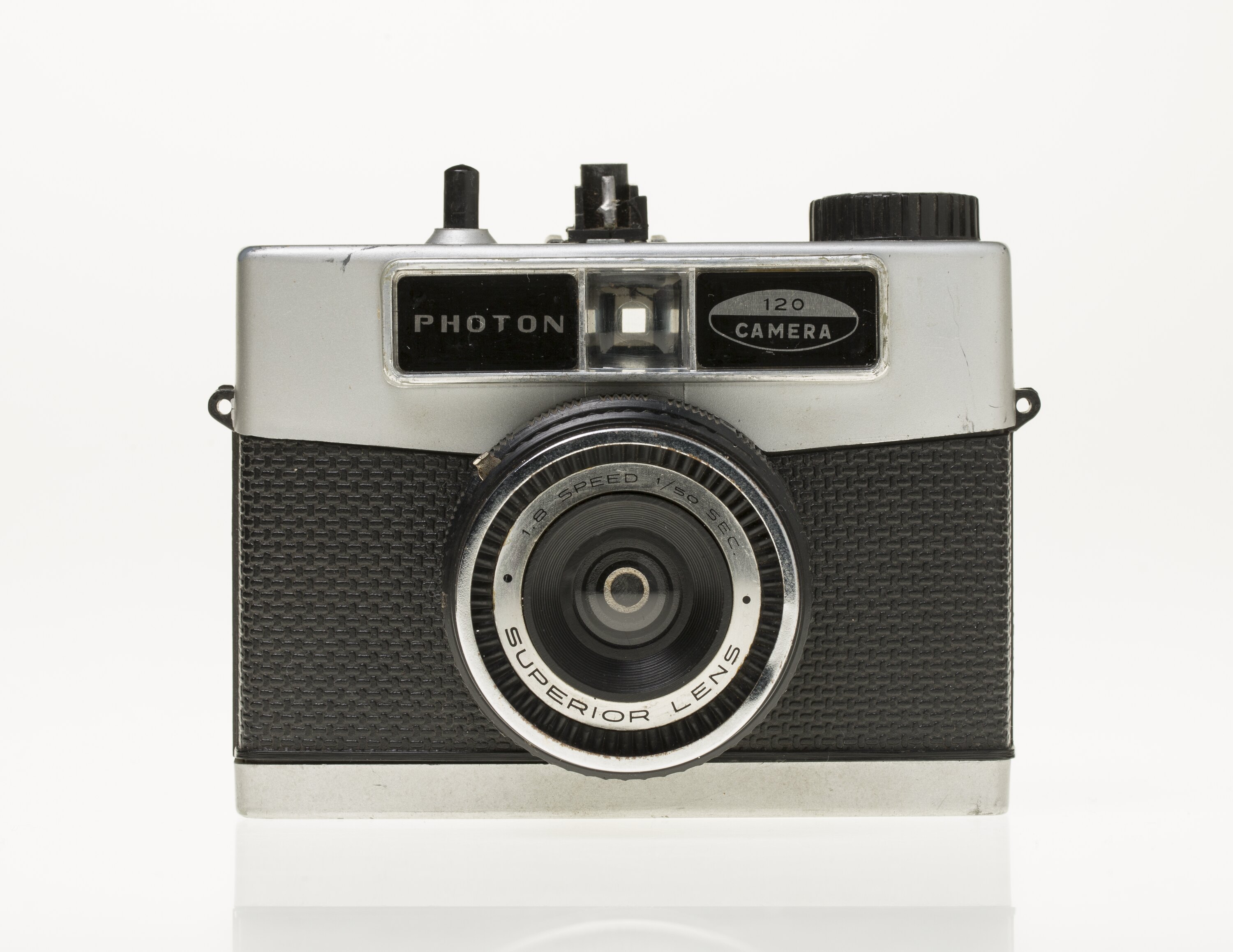 Inscribed on lens: '1.8 SPEED 1/50 SEC. SUPERIOR LENS'. Inscribed on either side of the view finder on face of the camera: 'PHOTON / 120 CAMERA'.
