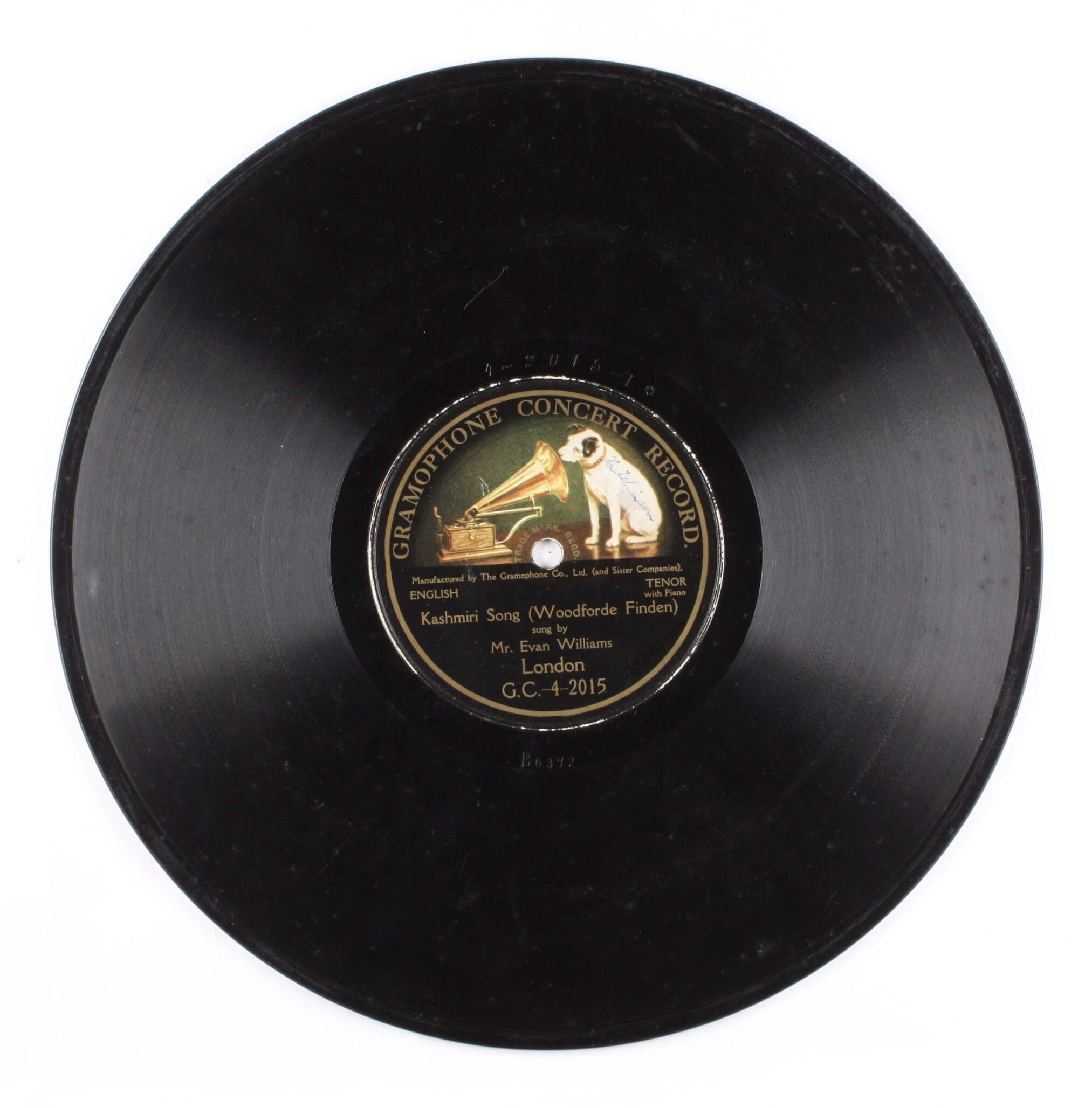TYPE: GRAMOPHONE CONCERT 10 IN. CONTENTS: "KASHMIRI SONG" (W. FINDEN), SUNG BY EVAN WILLIAMS, TENOR. COMPANY: MADE IN LONDON. TYPE DETAILS: BLACK LABEL. COMMENTS: CAT. NO. GC4- 2015. MATRIX NO. B6372. RECORDED CIRCA 1910. FORMERLY REGISTERED AT ST 028309. THAT NUMBER NOW CANCELLED.