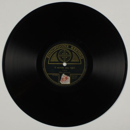 TYPE: ZONOPHONE 10 IN. CONTENTS: "HOB- NAILED BOOTS THAT FATHER WORE" AND "IT SERVED YOU RIGHT", BY BILLY WILLIAMS, COMIC. COMPANY: MADE IN UNITED KINGDOM. TYPE DETAILS: DOUBLE SIDED. COMMENTS: CAT. NO. 3097. RECORDED PRE WORLD WAR ONE.
