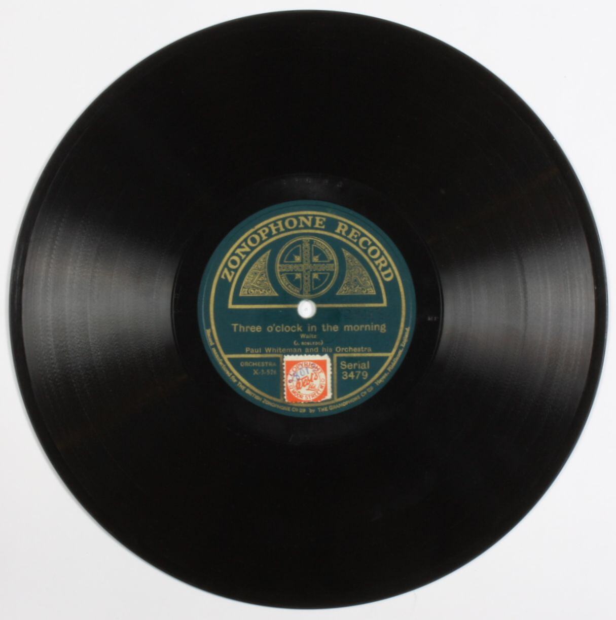 Side 1: ZONOPHONE RECORD (trademark) / Learn to smile - Fox Trot / LOUIS HIRSH / Paul Whiteman and his Orchestra / ORCHESTRA X-2-785 / (royalty stamp) / Serial 3479 / (run-out) 18778A 2-785 A25323 Side 2: ZONOPHONE RECORD (trademark) / Three o'clock in the Morning / Waltz / J. ROBLEDO / Paul Whiteman and his Orchestra / ORCHESTRA X-3-526 / (royalty stamp) / Serial 3479 / (run-out) 3-526 MP A26729