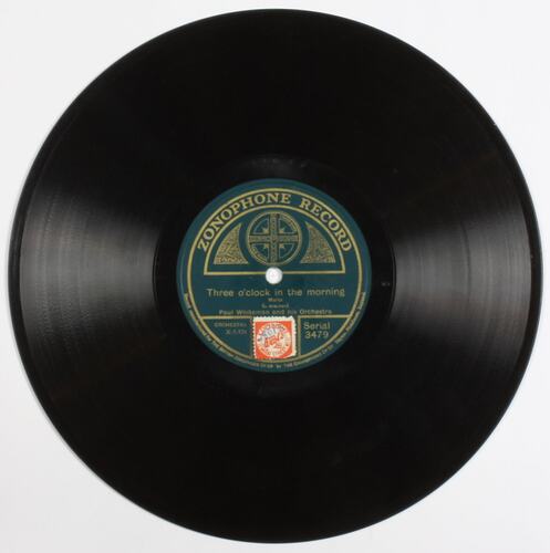 Disc recording (10 in), doubled sided, Zonophone, "Three o'clock in the morning" and "Learn to Smile", Paul Whiteman and his Orchestra, Cat. No. 3479