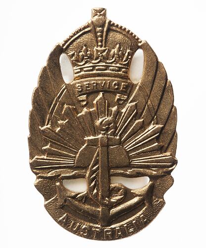 Gilt brass, rising sun, anchor over wings, surmounted by the word "SERVICE" under a crown, scroll underneath bears "AUSTRALIA". On reverse "1948 ISSUED BY C'WLTH GOVT A 2567 AMOR SYDNEY".