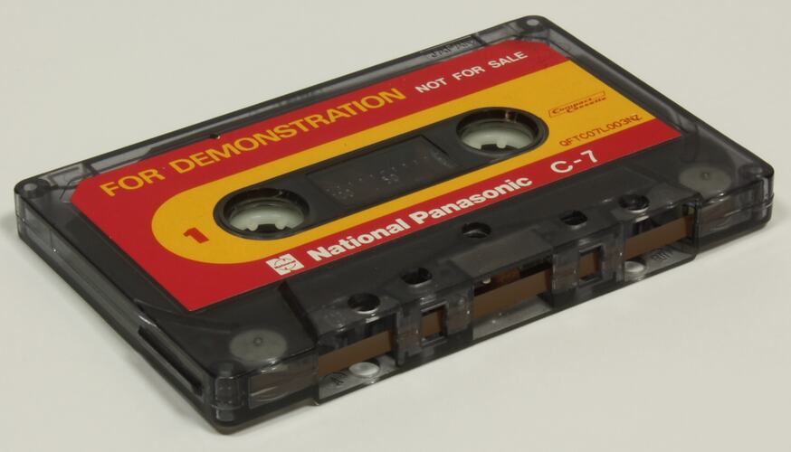 Audio cassette is labelled "National Panasonic C-7" "for demonstration" printed on side 1 of tape, "for recording" printed on side 2 of tape NB. Registration number has not been painted on object