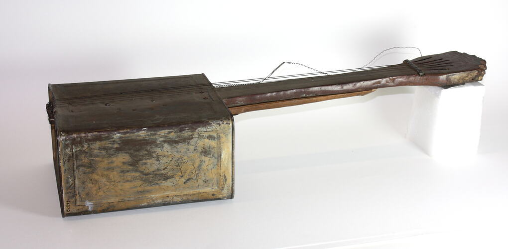 Rectangular body made from a repurposed motor oil (or similar) tin. Heavy wooden neck in two layers, without frets, inserted into crude hole pierced in body; neck also protrudes through lower end of guitar. Six strings, one broken. Strings terminate inside headstock, secured with bolts; at lower end they are fastened with a row of screws; a lower row of screws would have been used previously for stringing, suggesting the guitar had been used on more than one occasion. A small tin plate with off-cut corners covers the back of the headstock where the strings are fixed. The body has parallel ridges on base, and hole at top where the orignal content would have been accessed; original lid on hole missing. Two small depressions on either side of the hole indicate that a handle had orginally been welded there or would have been positioned there if added, supporting the identification of the tin as motor oil. Remnant gold and silver-coloured surface finishes, unlikely original. The lower layer of the neck has a smooth, tapered finish, suggesting it was orignially part of another item, or even a musical instrument.