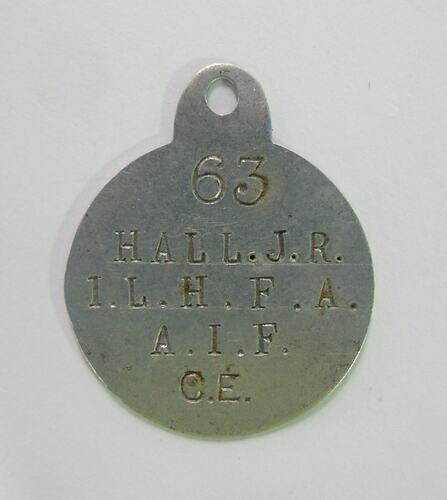 Aluminium disc stamped '63 Hall. J. R. 1. L. H. F. A. A. I. F. C. E.'
